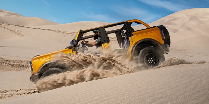 Two-door Broncos seat four people, while the four-door models seat five. With either option, you'll find two rows of spacious seats that will allow even taller riders to sit comfortably. All models include drain plugs so you can hose out the interior after a muddy excursion. The vehicle also comes standard with an 8-inch touch-screen display, a USB port, and wireless Apple CarPlay and Android Auto connectivity. Available upgrades include a massive 12-inch touch-screen display, navigation, extra USB ports, and wireless device charging.