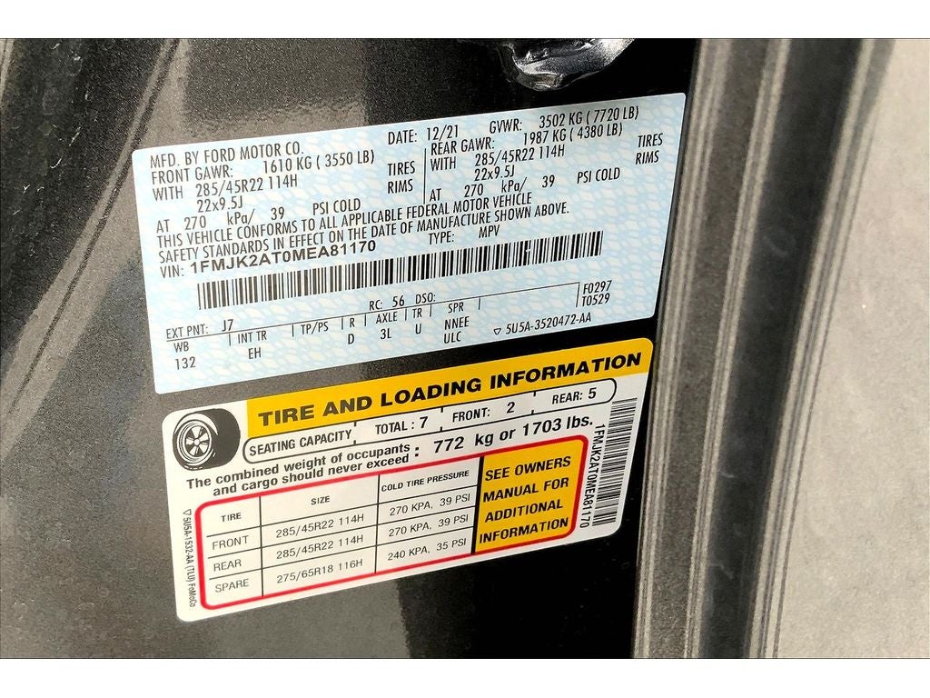 Special Edition Package: 22" Premium Black-Painted Aluminum Wheels; Heavy-Duty Trailer Tow Package; Continuous Controlled Damping (CCD); P285/45R22 AS BSW Tires. Equipment Group 302A High Package: LED Headlamps and Fog Lamps; 3.5L EcoBoost V6 Engine; Heated and Ventilated Leather Front Captain's Chairs; Panoramic Vista Roof; 7. 550 lbs GVWR; P285/45R22 AS BSW Tires; B&O Sound System by Bang and Olufsen; 360-Degree Camera with Split View. Cargo Package: Black Roof Rail Crossbars. Panoramic Vista Roof. ControlTrac with 3.73 Axle Ratio. Continuous Controlled Damping (CCD). Heavy-Duty Trailer Tow Package. LED Headlamps and Fog Lamps. 2nd Row Leather-Trimmed Captain's Chairs with Armrest. **Equipment listed is based on original vehicle build and subject to change. Please confirm the accuracy of the included equipment by calling the dealer prior to purchase.**